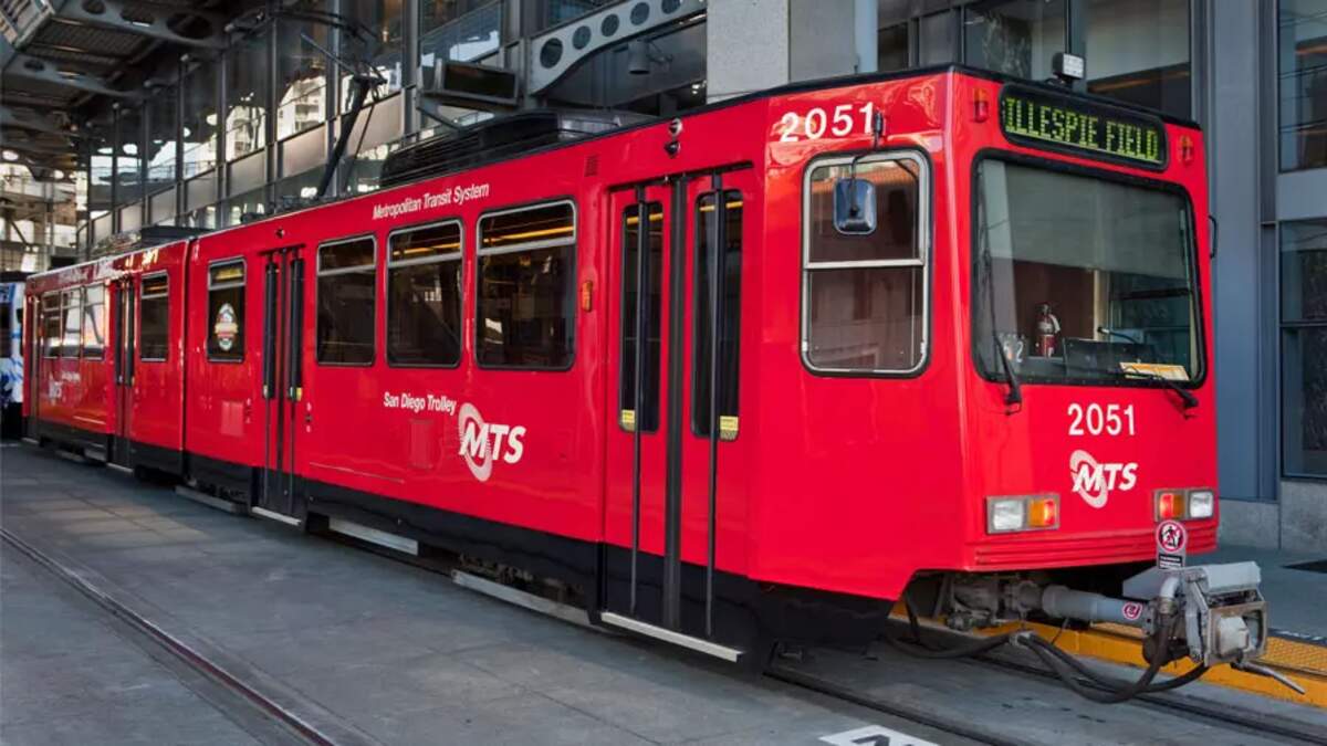 The light-rail tram hit the victim at Main and Sigsbee streets shortly before 1:30 p.m., according to the San Diego Police Department.